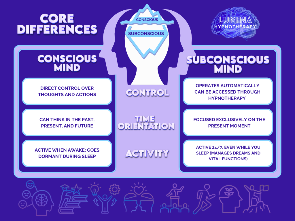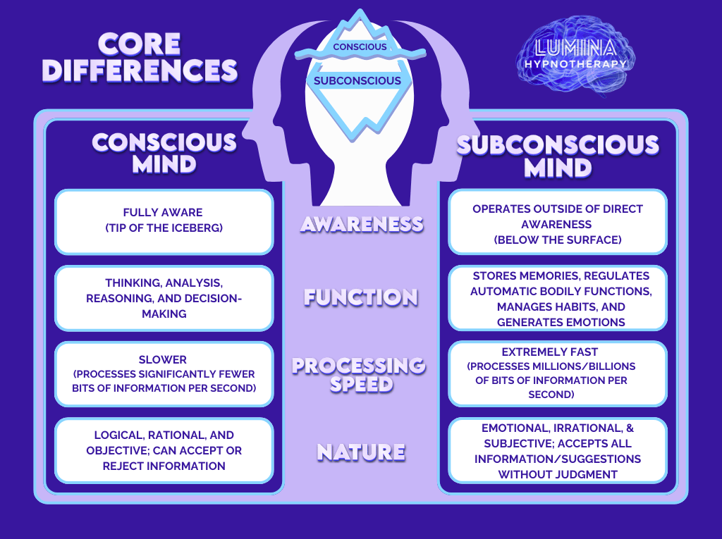 The main distinction lies in awareness and function: the conscious mind is where you experience your current thoughts and make active decisions, while the subconscious mind operates automatically, handling involuntary bodily functions, storing memories, and running habits without direct awareness.